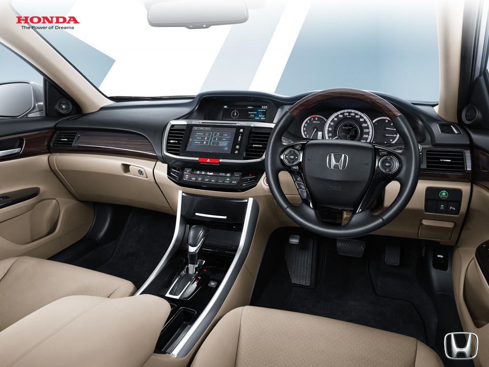 Desain baru juga tampak di interior New Honda Accord, yang kini menggunakan perpaduan Alaska Wood Panel dan Gloss One Black untuk menciptakan atmosfir hangat dan elegan. Sistem audio baru dengan layar sentuh 7.5 inchi dapat terkoneksi dengan gadget dan memiliki fitur WiFi tethering yang memungkinkan akses internet selama perjalanan, serta NAVI system untuk menampilkan rute berkendara dalam peta 3 dimensi. Fitur Speed-sensitive Volume Compensation (SVC) berguna untuk mengatur volume audio secara otomatis sesuai dengan kecepatan berkendara.